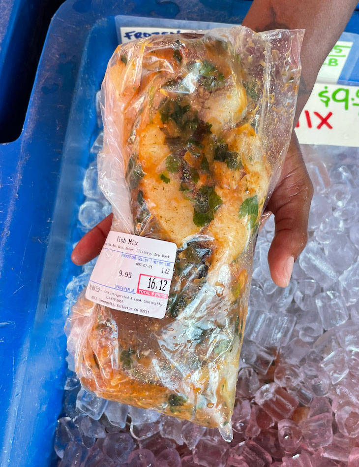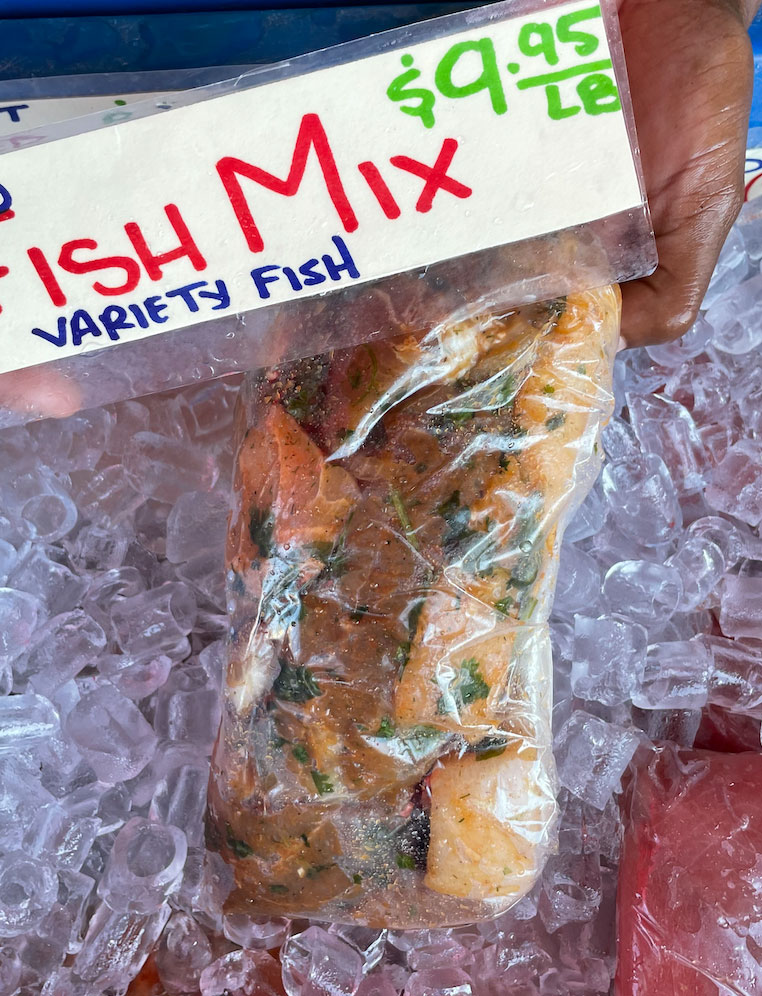 A mix of various fish trimmings mixed with seasoning, onion and cilantro. Great for fish tacos or stews.