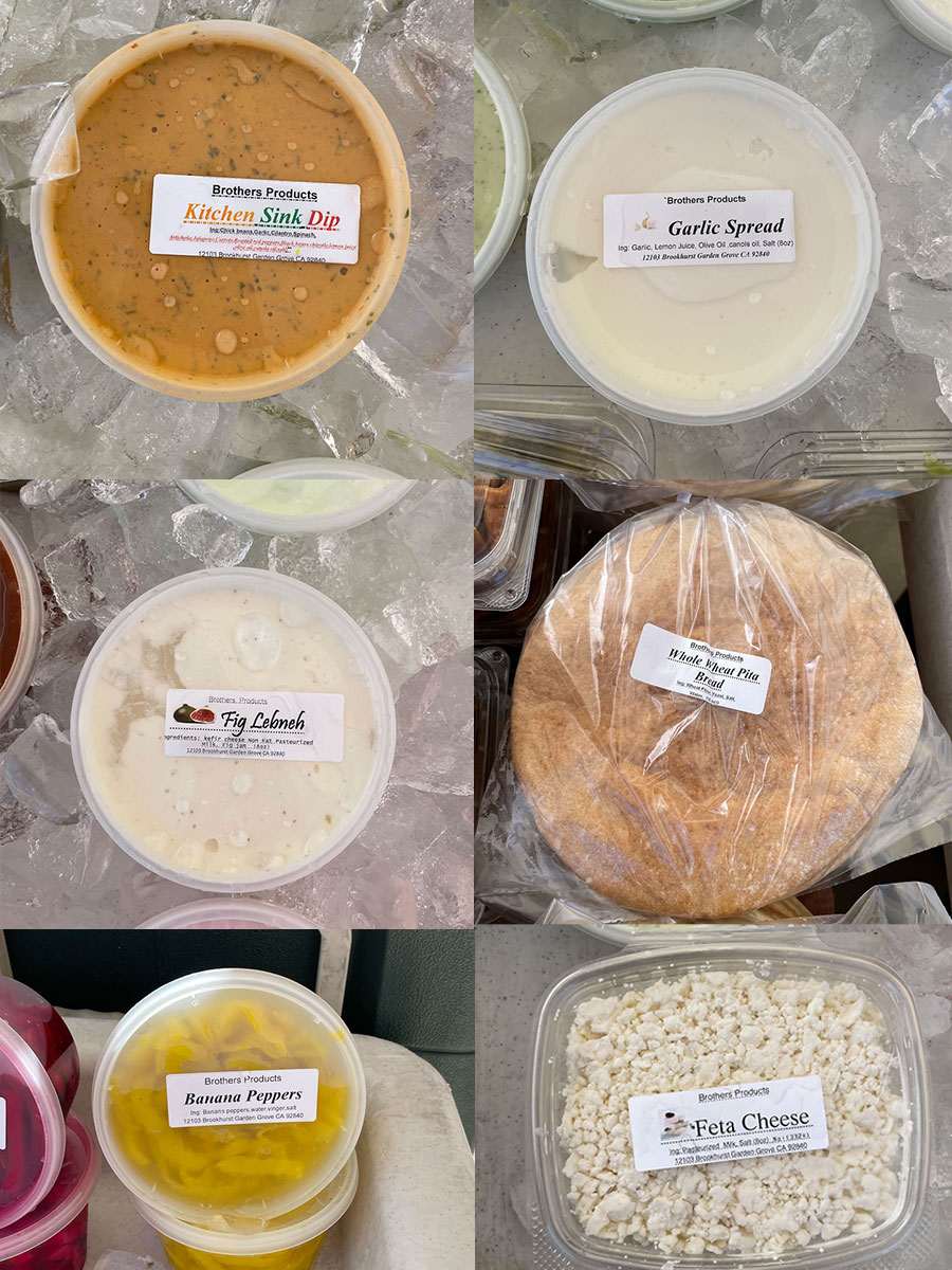 Options: Traditional Hummus | Roasted Garlic Hummus | Avocado Hummus | Cilantro Hummus | Roasted Red Pepper Hummus | Chipotle Black Beans Hummus | Spicy Hummus | Habanero Hummus | Artichoke Hummus | Garlic Spread | Garlic & Sun Dried Tomato Spread | Spinach Artichoke Garlic Spread | Basil Garlic Spread | Chipotle Garlic Spread | Jalapeno Garlic Spread | Rosemary & Ginger Garlic Spread | Kitchen Sink Dip | Brothers Mix Dip | Cali Dip | Three Layer Dip | Tzatziki | Tahini | Jerusalem Za’atar | Sumac | Falafel Chips | Baked Chips | Pita Bread | Whole Wheat Pita Bread | Pita Chips | Baklava | Stuffed Grape Leaves | Artichoke Salad | Mix Beans Salad | Tabbouleh Salad | Feta Cheese w/ Sun Dried Tomatoes | Feta Cheese | Eggplant Appetizer | Jalapeno Cheese | Spicy Cheese | Kalamata Olives | Kalamata Olives & Artichokes | Spicy Green Olives | Green Olives | Spicy Mixed Vegetables | Harissa | Yellow Peppers | Pickled Cucumbers | Pickled Turnips | Banana Peppers | Spinach Basil Pesto | Sun Dried Tomato Pesto | Vegan Pesto | Fig Lebneh | Kiwi Lebneh | Strawberry Lebneh | Chocolate Lebneh | Red Guava Lebneh | Coconut Lebneh | Red Raspberry Lebneh | Lemon Twist Lebneh | Spicy Lebneh | Za’atar Lebneh